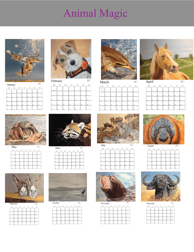 A mixture of wild and domesticated animals make up my 2025 offering. There may be a couple of changes in the monthly pictures as we go through the year because I'm always painting new subjects. But you get the drift!